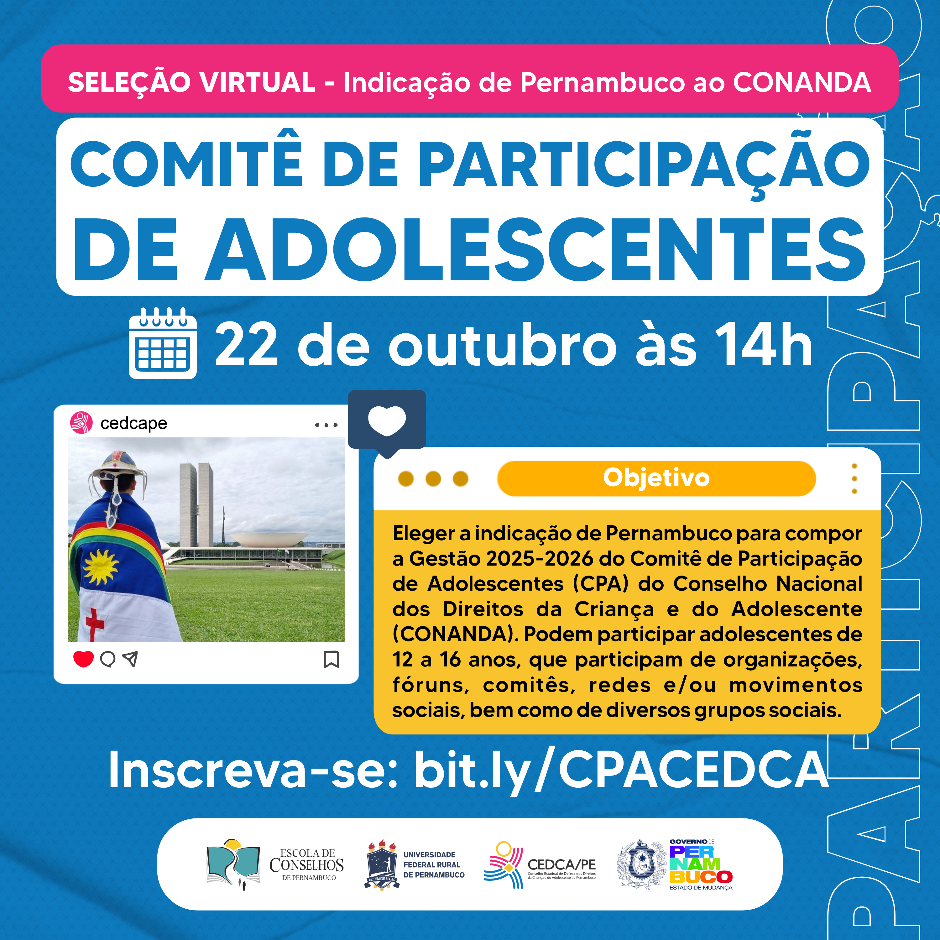 O Conselho Estadual de Defesa dos Direitos da Criança e do Adolescente de Pernambuco (CEDCA/PE) informa que estão abertas as inscrições para a indicação de adolescentes ao Comitê de Participação de Adolescentes (CPA), vinculado ao Conselh...