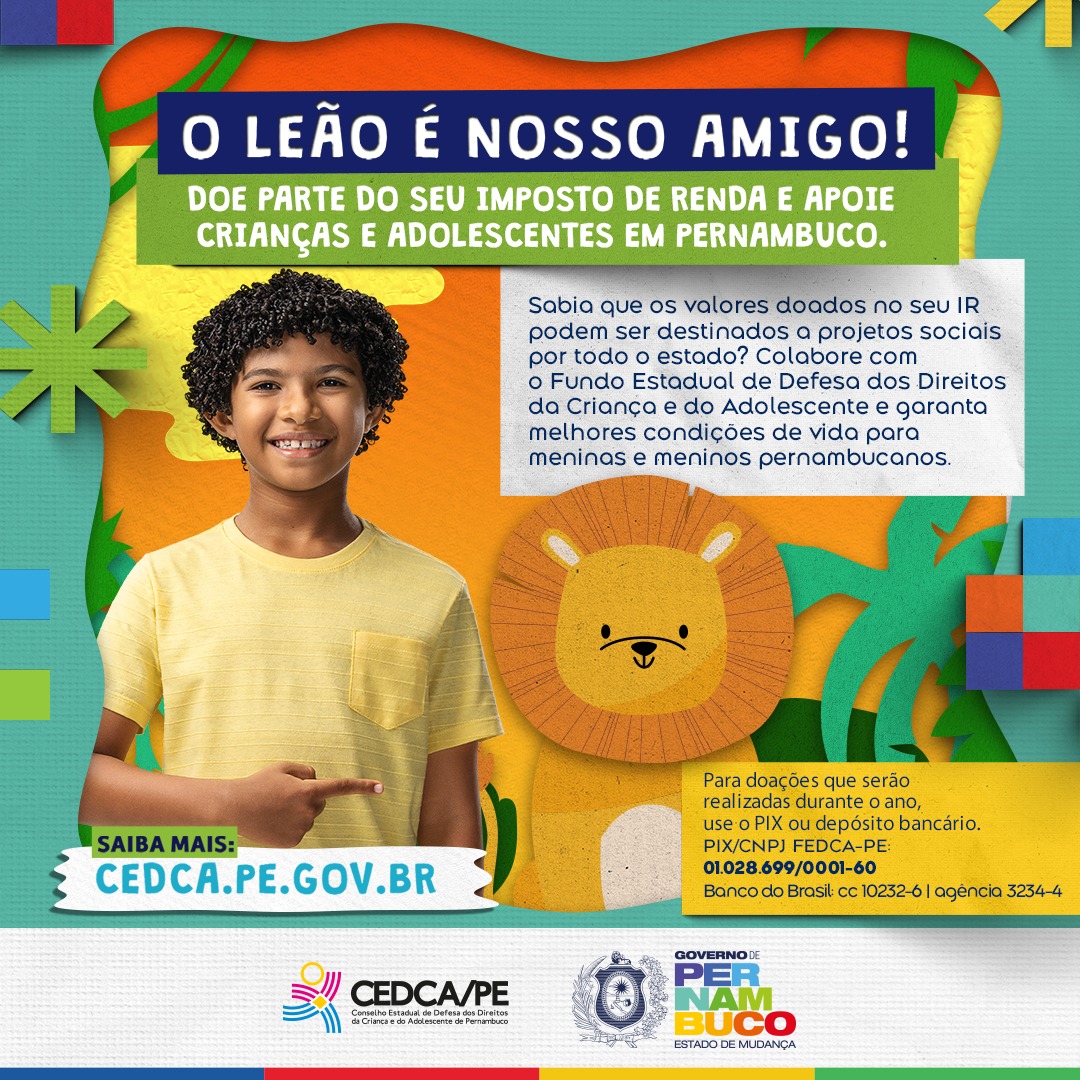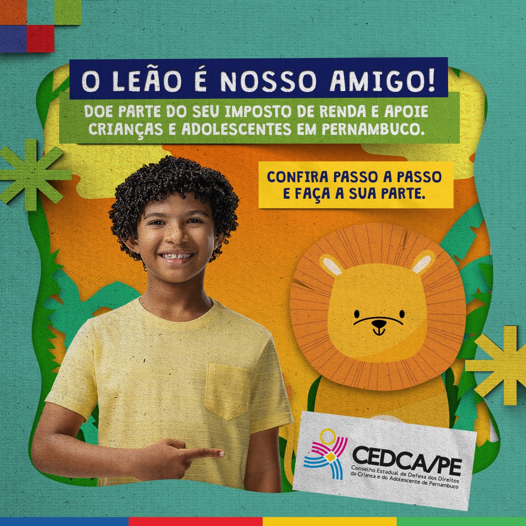 O Conselho Estadual de Defesa dos Direitos da Criança e do Adolescente de Pernambuco (CEDCA/PE) lançou a campanha "O Leão é o Nosso Amigo", uma iniciativa que encoraja tanto pessoas físicas quanto jurídicas a direcionarem parte do seu Impost...
