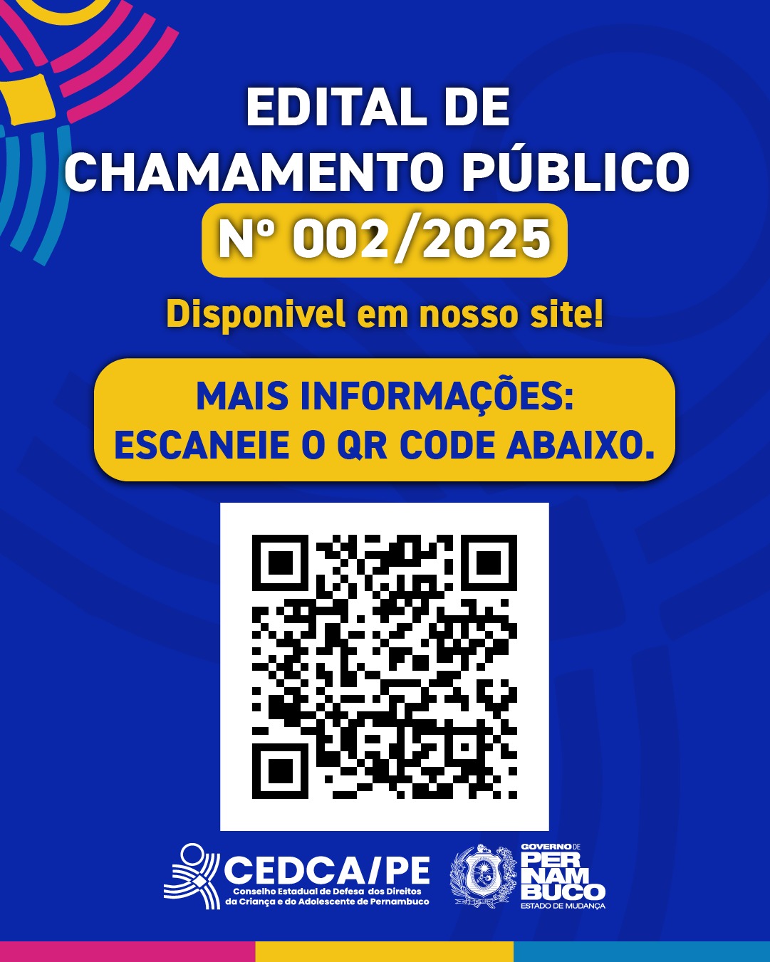 O Conselho Estadual dos Direitos da Criança e do Adolescente de Pernambuco (CEDCA/PE) informa que está disponível o Edital de Chamamento Público para captação de recursos, acompanhado de seus anexos. O edital tem como finalidade apoiar e fo...