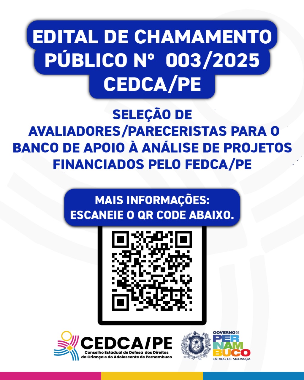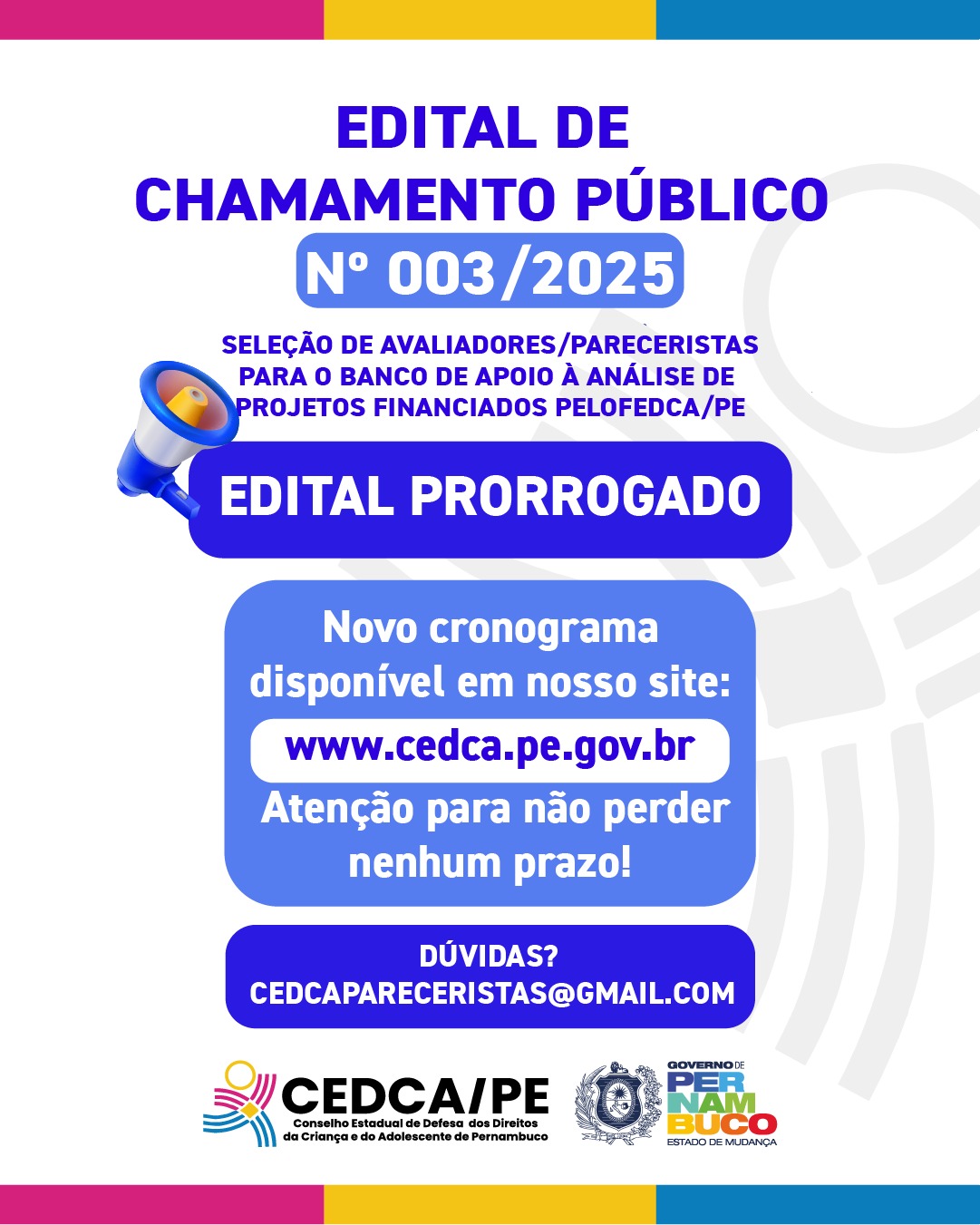 O Conselho Estadual de Defesa dos Direitos da Criança e do Adolescente de Pernambuco (CEDCA/PE) informa que o Edital nº 003/2025, destinado à seleção de pareceristas/avaliadores para o Banco de Apoio à Análise de Projetos Financiados pelo F...